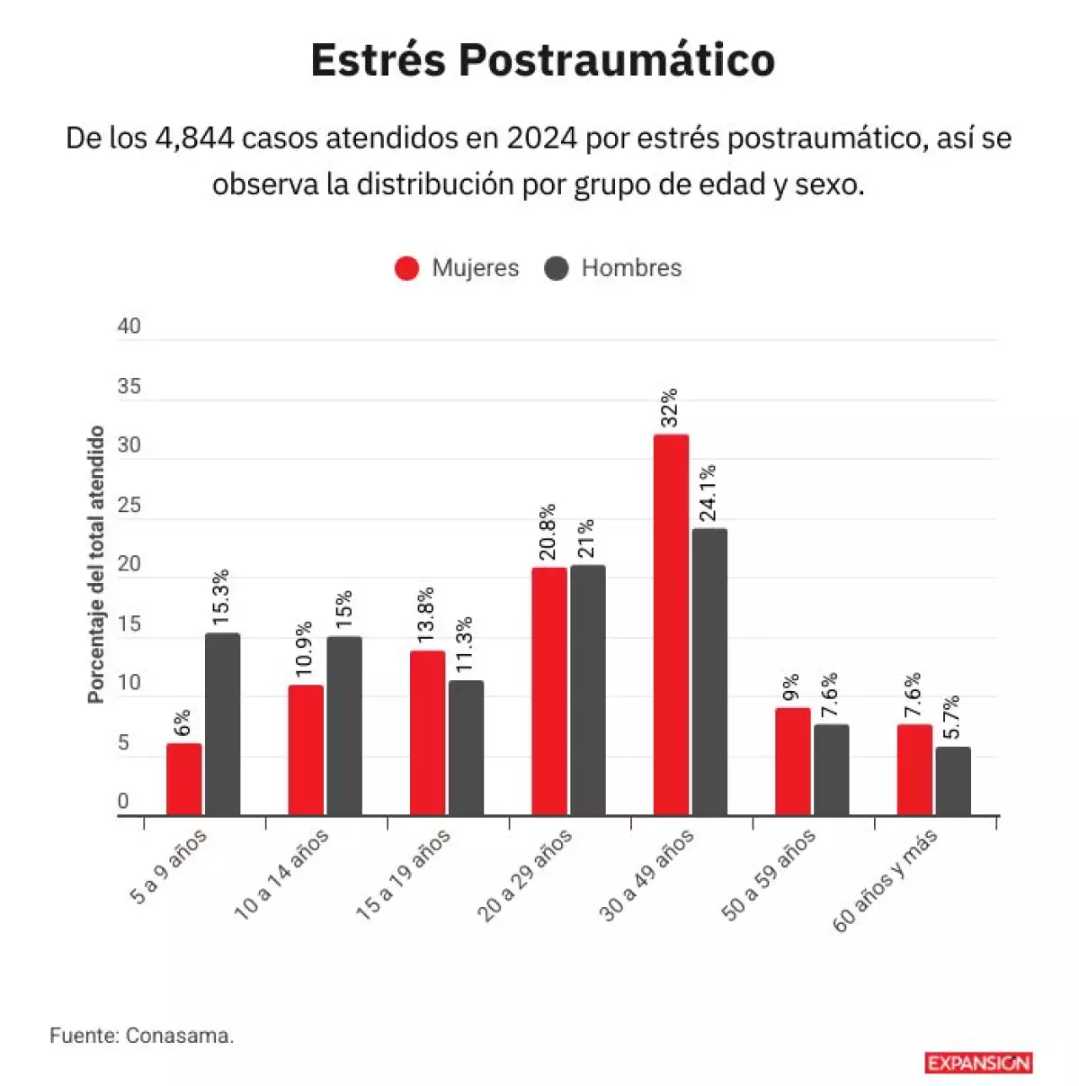 En 2024, la Comisión Nacional de Salud Mental y Adicciones (Conasama) reportó la atención médica de 4,800 casos de estrés postraumático, de los que 32% correspondieron a mujeres de 30 a 49 años.