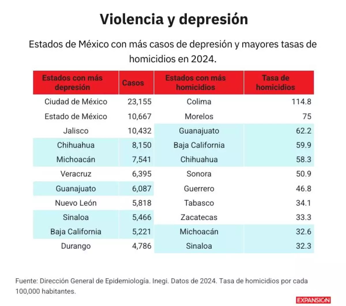 Algunos de los estados, por ejemplo, con más casos de depresión en 2024 coinciden con aquellos con las tasas de homicidio más elevadas.
